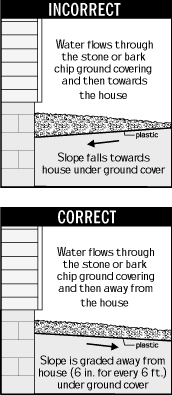 Bushes near the foundation, planted above the original foundation hole, often settle. If there is bare soil under the bushes, just add more soil. However, adding more than a few inches of soil can damage bushes by eliminating air from the roots. Check with a professional landscaper on the potential damage to your type of bushes. You may need to raise the bushes and fill under them.If the area around the foundation has a planting bed or bushes with a ground cover, the soil under the ground cover must pitch away from the foundation. (See figure on right) . Dig through the ground cover in several areas to check the grade of the soil. To improve this situation, remove the ground cover and fill with soil. Then replace the ground cover.