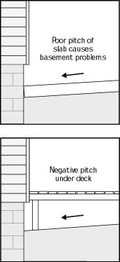 All hard surfaces as walks and driveways should also be pitched away from your foundation. The good news is that only a slight grade, as little as 1/4" per foot, is adequate for hard surfaces. (See figure on left).