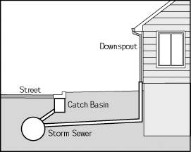 Newsletter: Gutters collect tremendous quantities of water from the roof and must deliver that water away from the foundation. Keep you downspouts extended at least 6 to 8 feet away from the foundation to a spot where the natural grade of the soil continues moving the water away.If your area has underground storm sewers, make sure all downspouts are properly connected to the visible pipe fittings and that water flows into the storm sewer pipe during rainstorms. If this pipe backs up during a storm, it indicates that the storm sewer line is plugged or broken. Test the line by running a hose into the gutter. You can have this line cleaned by a sewer cleaner.